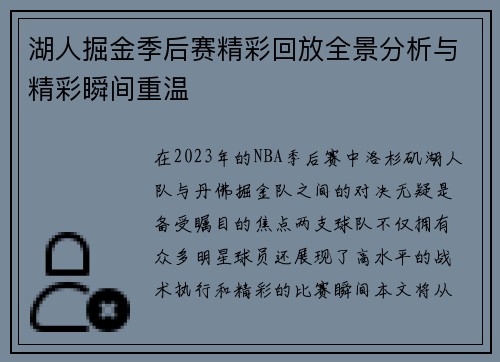 本篇文章将对鹈鹕与湖人之间的精彩对决进行回顾,带领读者重温那些让球迷热血沸腾的瞬间。两队作为NBA西部联盟的劲旅,每次交锋都吸引了无数关注。本篇文章将从比赛激烈程度、明星球员表现、关键时刻回顾以及球迷氛围四个方面深入分析这场对决的精彩之处。通过细致的描述和生动的场景重现,让我们再次感受篮球赛场上那种难以忘怀的激情与魅力。乐虎国际官...
